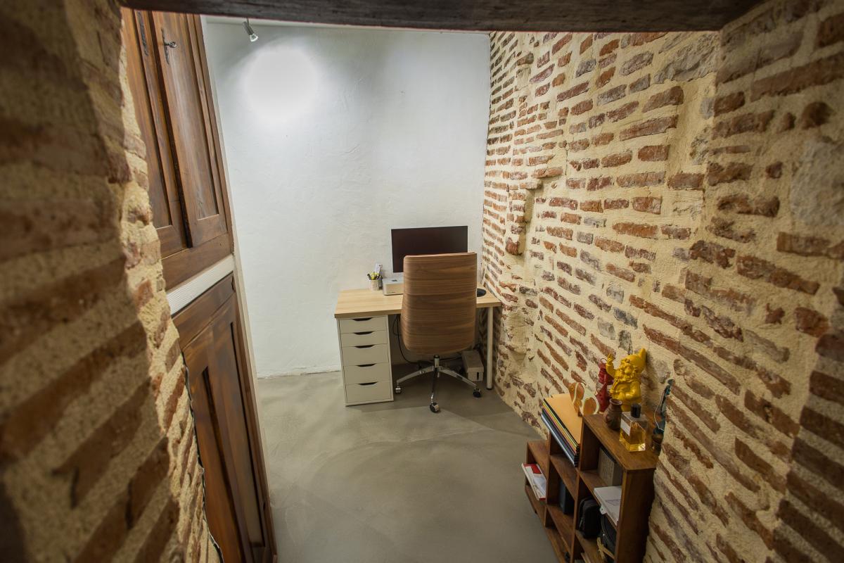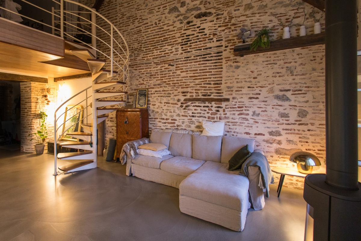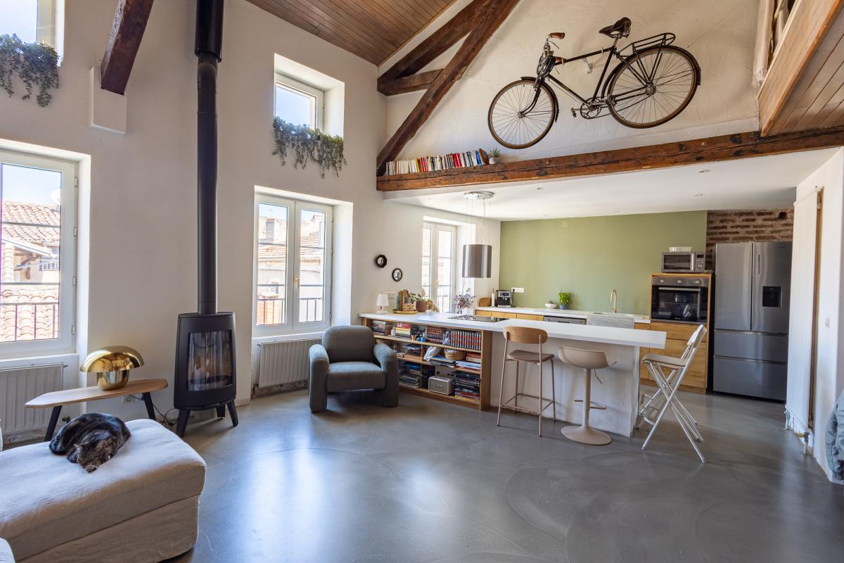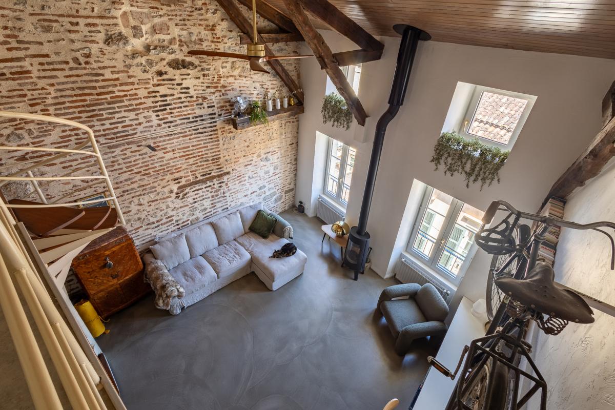 Le séjour cathédrale est surplombé par une mezzanine pouvant faire office de chambre, de bureau ou d'atelier.