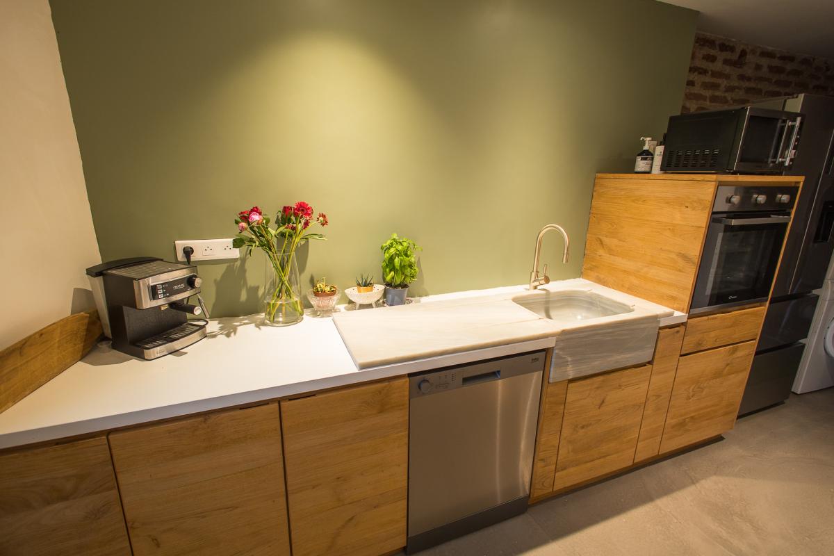 Cuisine contemporaine en bois massif et évier en marbre, cellier attenant.