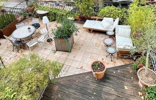 Au premier étage: une cuisine meublée et équipée, une salle à manger avec balcon, deux salons disposant d'un accès à la terrasse. Les espaces sont ouverts et permettent une circulation fluide. Les ouvertures de part et d'autre offrent une belle luminosité.